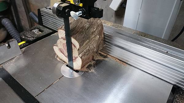 買了這機器雖不是直接跟原廠買,賣家也很熱心的來做基本調整跟說明,等到調整好機器後拿塊龍柏來試切看看,還沒製作治具切割要特別小心。