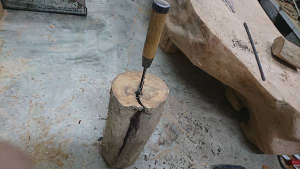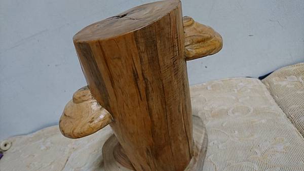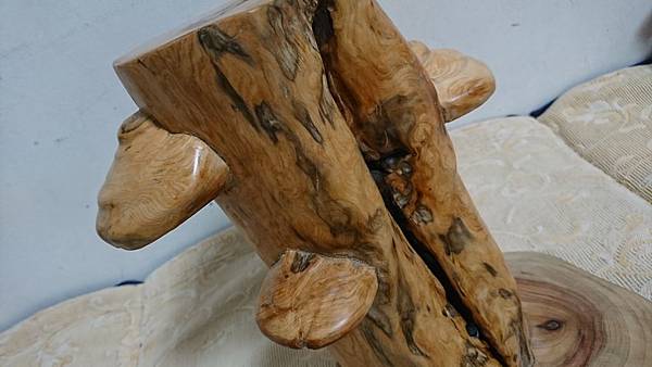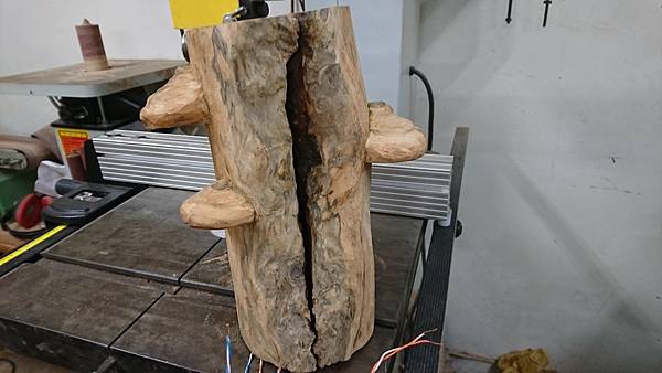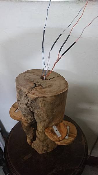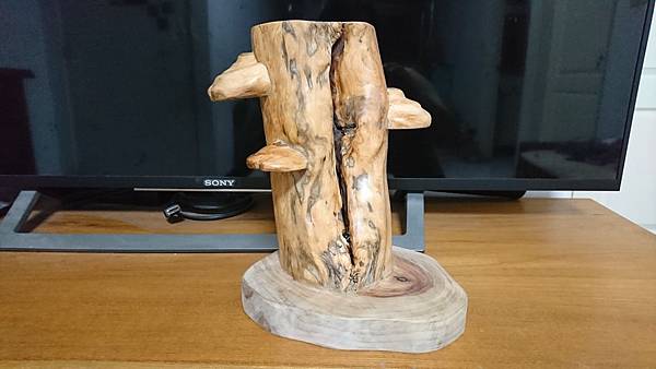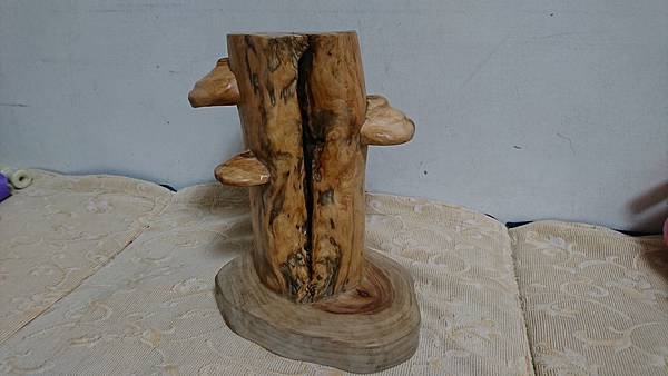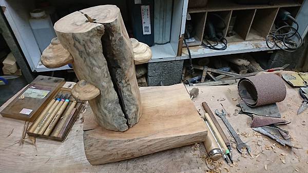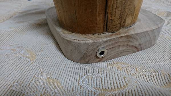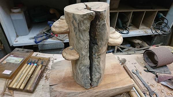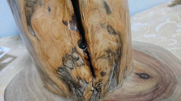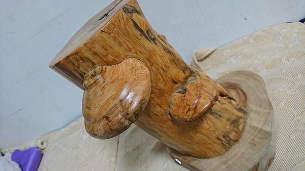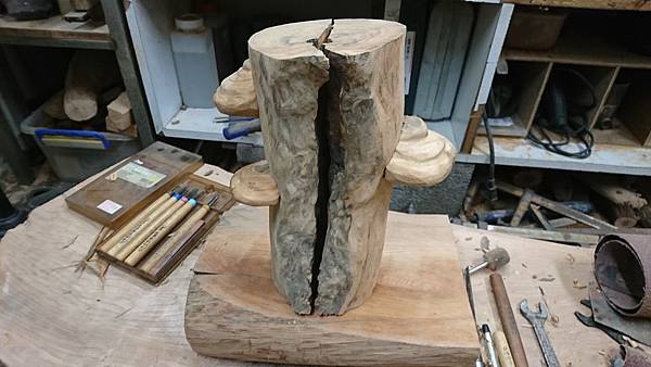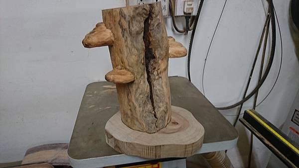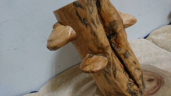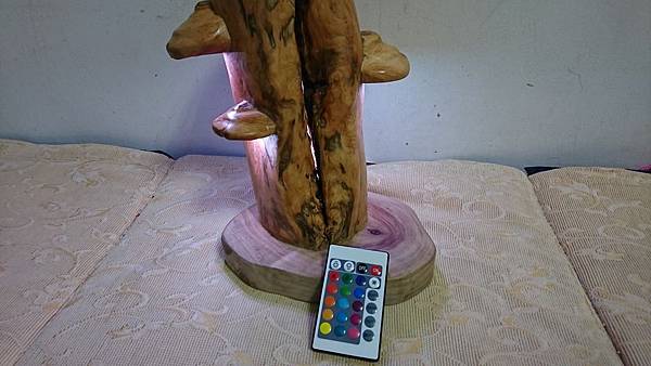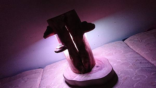 蘑菇造型小夜燈,使用中心有裂開的黃檜木料將他剖開利用。